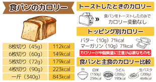 5枚切りの食パン1枚で179kcalとなり、バター10gを使うと250kcalとなります。